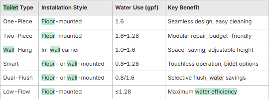The most common toilet types include one-piece, two-piece, wall-hung, smart, dual-flush, and low-flow models, each designed for specific installation needs, water efficiency goals, and aesthetic preferences.